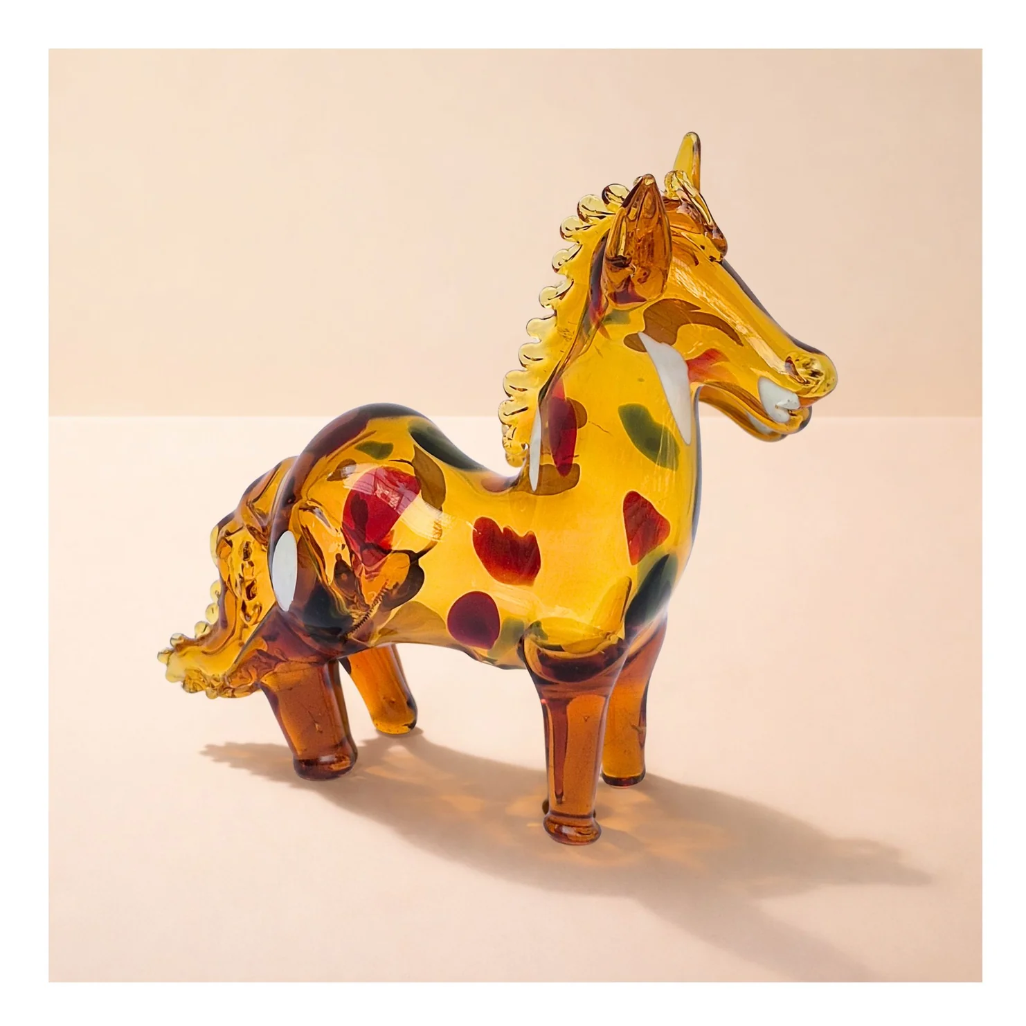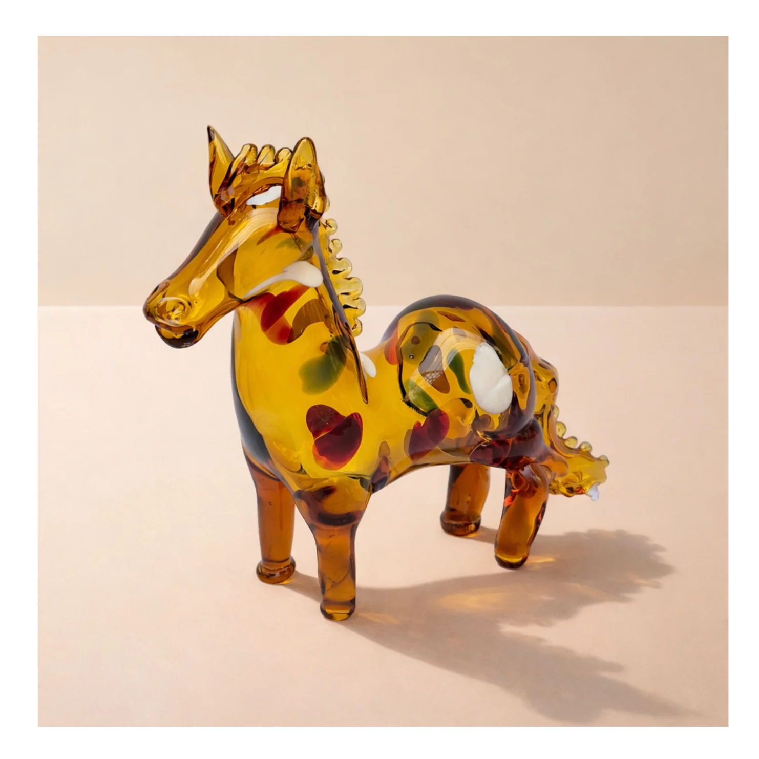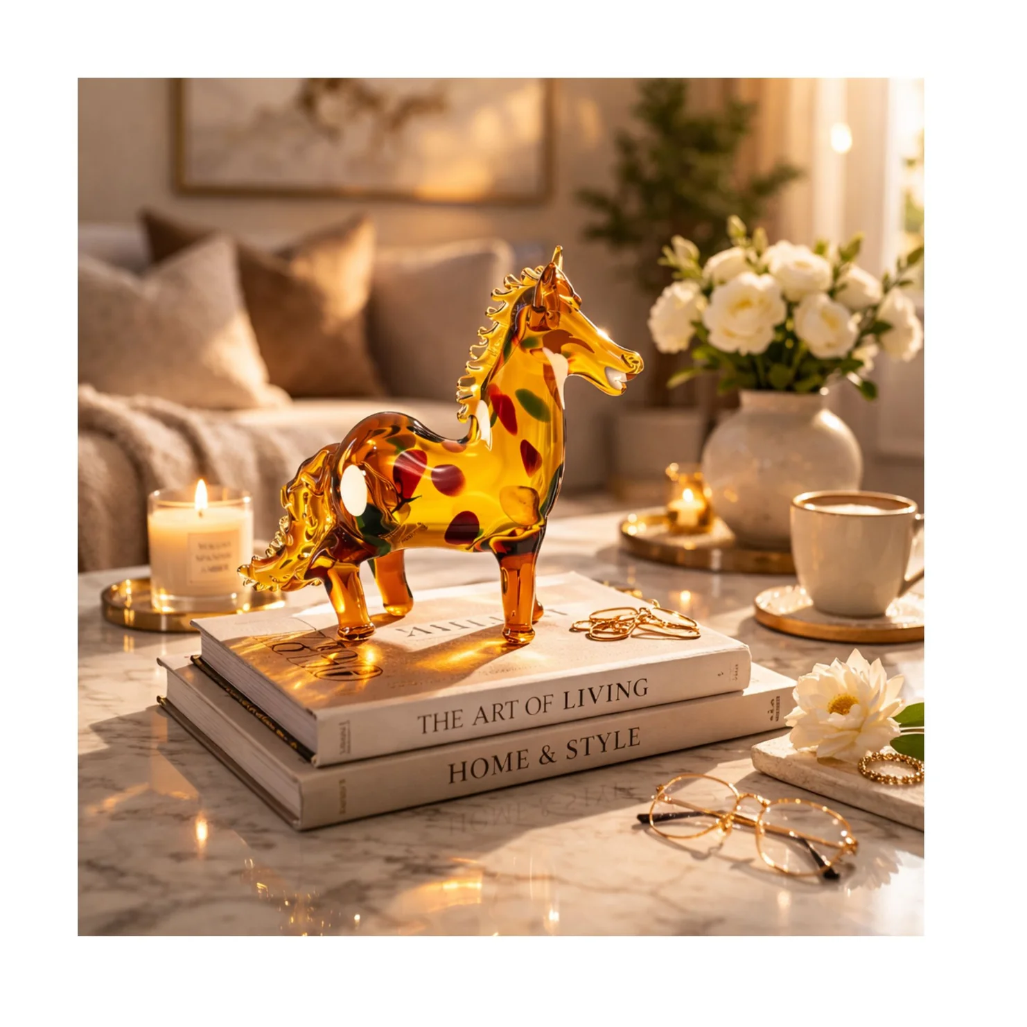 Its luminous amber body glows from within — layered with drifting crimsons, forest greens, and soft ivory accents. The sculpted mane rises in fluid motion, while the poised stance reflects strength without aggression — presence without noise.